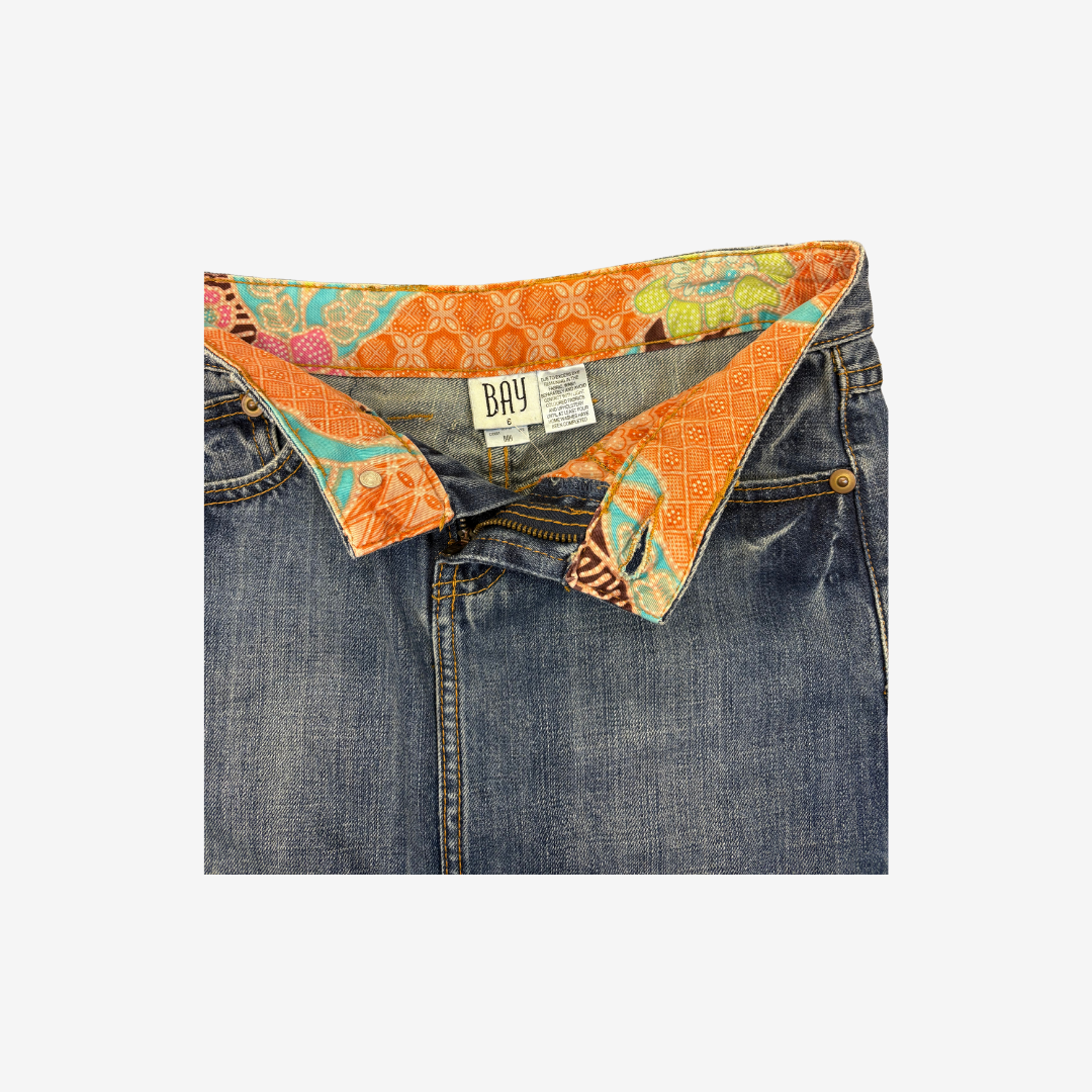 Dark wash 'Distressed' look Featuring a raw hem and a slit in the back.