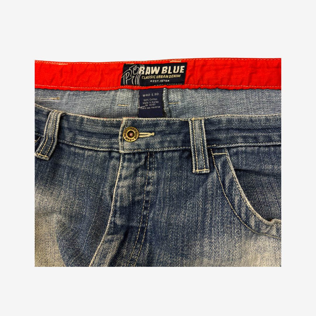 Authentic early–2000s RawBlue men’s jeans. Dark wash with faded front panels and classic Y2K baggy silhouette.